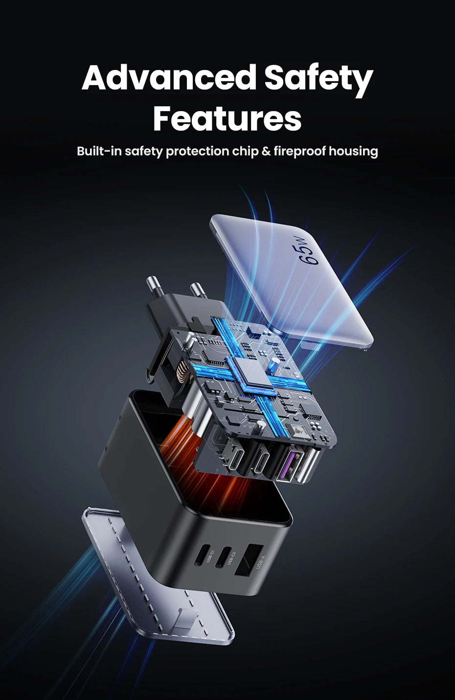 3 ports fast charging ;65W Max output;EU/US/UK Plug available;Advanced GaN & Sic chips