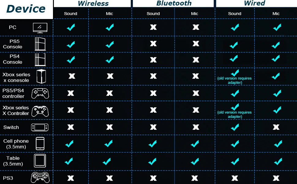 Connection Types: Wireless (2.4GHz / Bluetooth) & Wired (3.5mm)