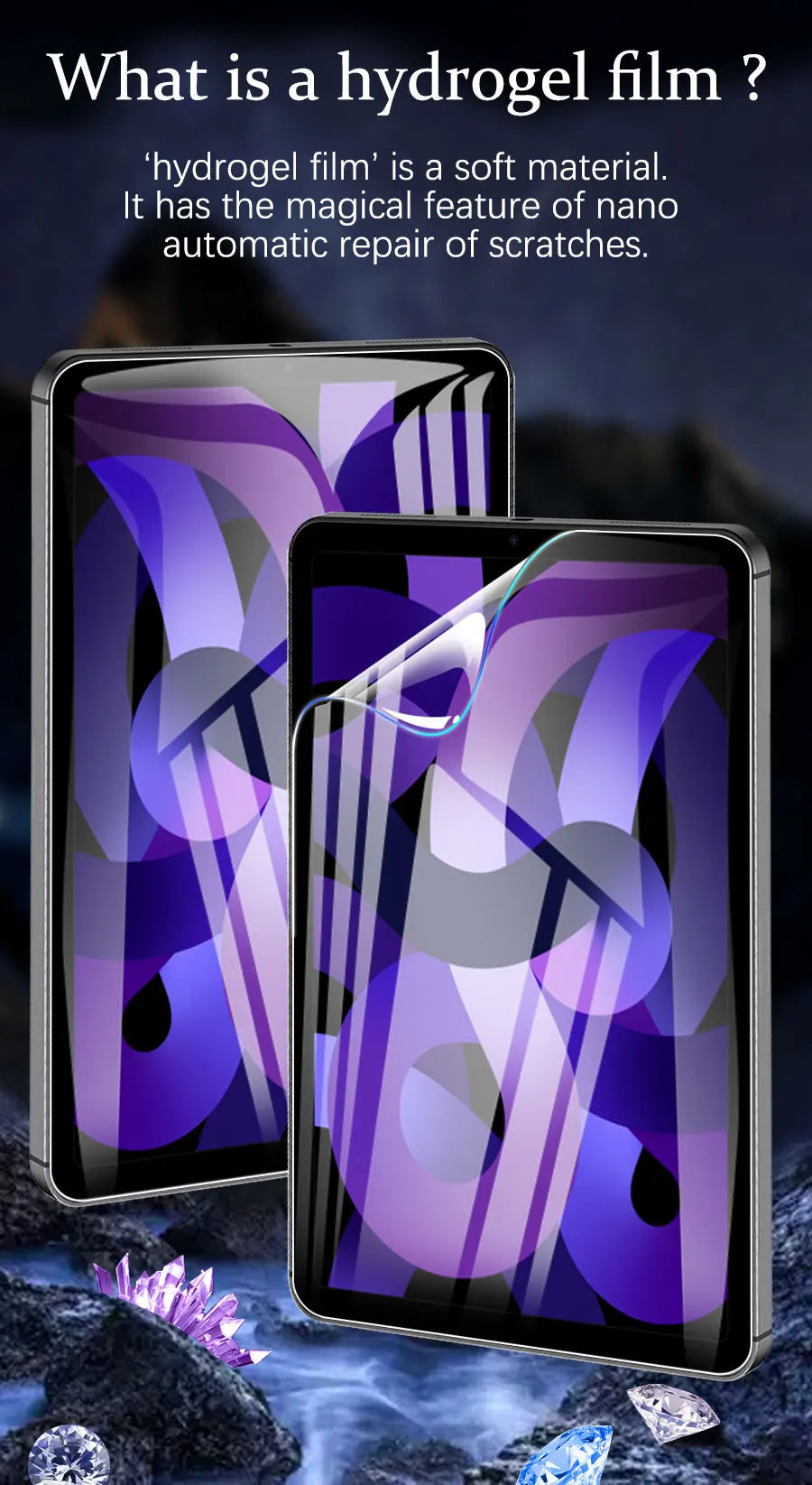 "Hydrogel fillet" is a soft material. It has the magic feature of nano automatic scratch and bubble repair. This hydrogel film can repair minor scratches and bubbles automatically. Important: Before installation, keep the screen clean, free of dust. If there are still bubbles on the screen after this film is pasted, please do not tear off the new film immediately. Please be patient and let the hydrogel film recover automatically.